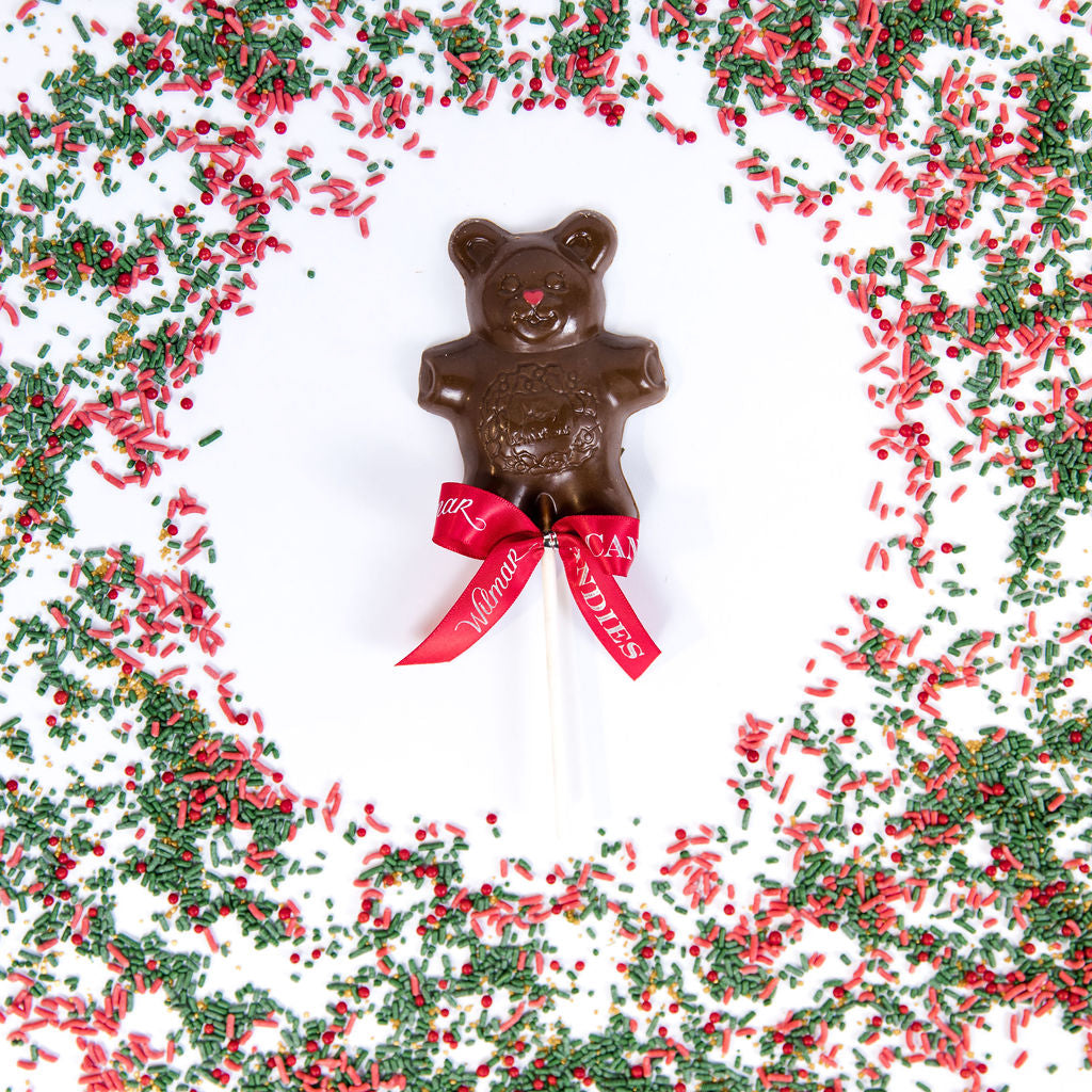 This cute bear is adorned with a wreath on its belly! Handcrafted with the highest quality confectioner's coating. 1.7 oz.