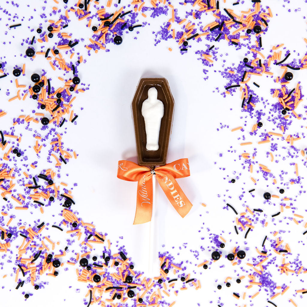 Unwrap the Halloween magic! This mummy is tucked away into his coffin. Handcrafted with the highest quality confectioner's coating. 1 oz.
