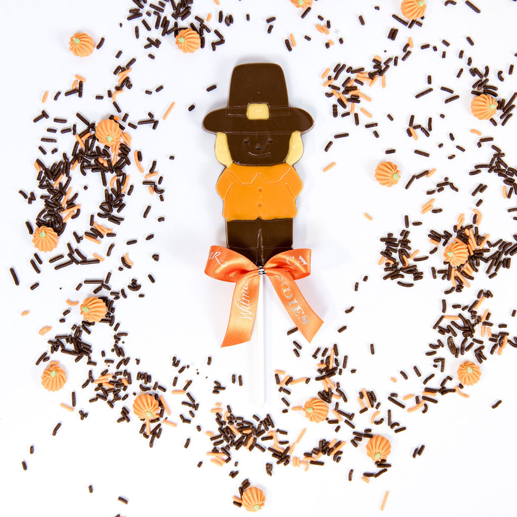 Get into the autumn spirit with the Pilgrim Man pop, handcrafted with the highest quality confectioner's coating.